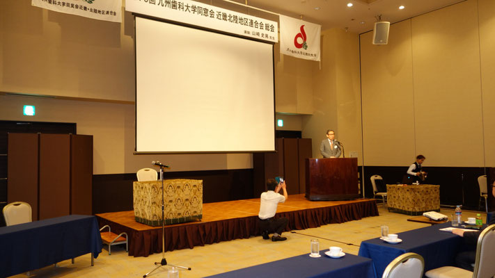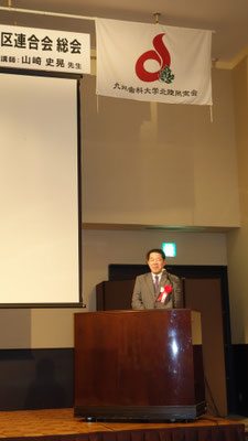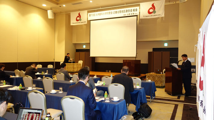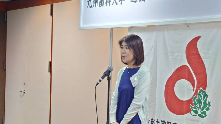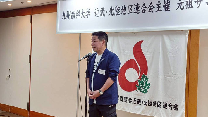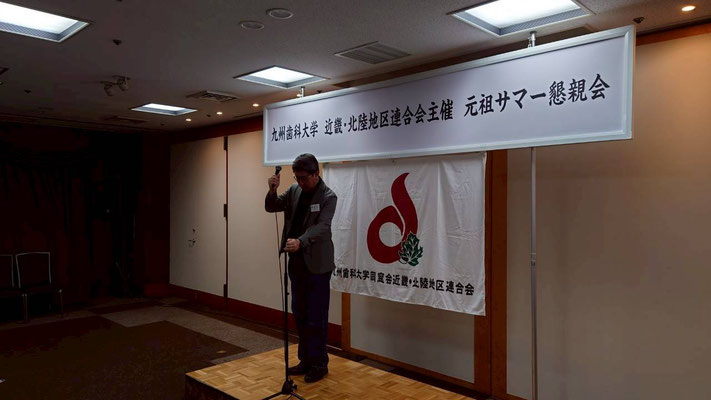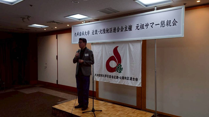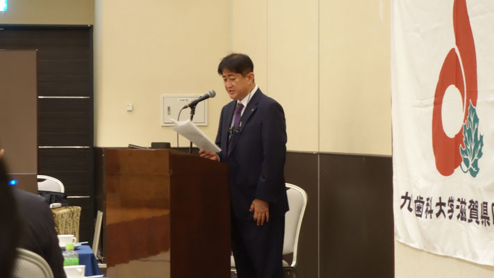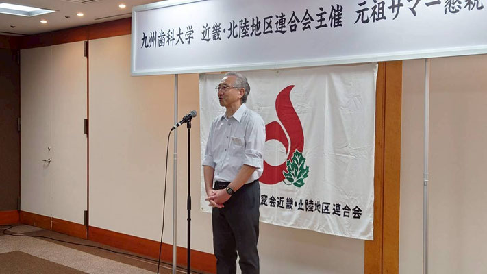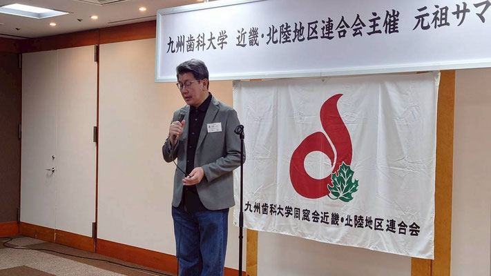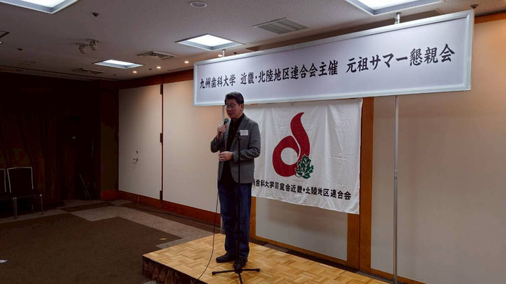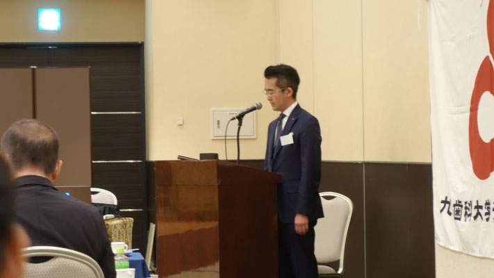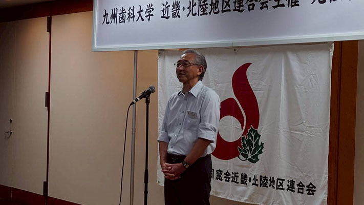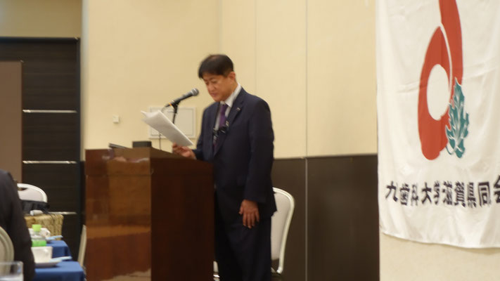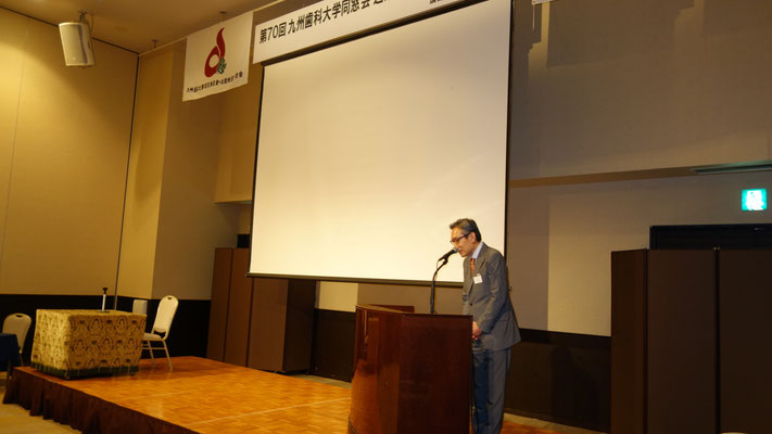 続いて来賓としてご臨席を賜りました九州歯科大学同窓会会長の森章(大35期)先生が挨拶に立ち 同窓会の現状に鑑み 再来年予定している同窓会百周年記念事業についてなお一層のご協力をお願いすること 百周年はゴールではなく まださらに続くので若手の先生方や学生さんにも同窓会活動の意義を理解して頂き さらなる会員の増強に協力をお願いする旨のご挨拶がありました