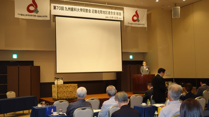 本部同窓会会長の森章先生(大35期)、九州歯科大学理事長学長の粟野秀慈先生(大40期)のご臨席を賜り、さらに70名の参加者を得て、大盛況となりました。近畿・北陸地区連合会副会長の杉典子先生(大45期)の開会の辞に続き、近畿・北陸地区連合会会長の長崎三男先生(大29期)のご挨拶、森章会長のご挨拶、粟野秀慈理事長学長のご挨拶と続き、大阪大学歯学部附属病院の丹羽均特任教授(大32期)の紹介が行われました。