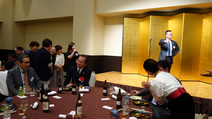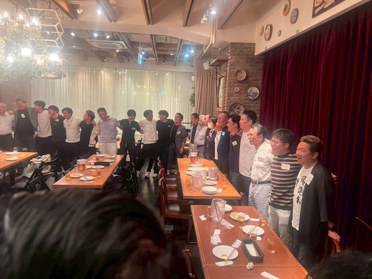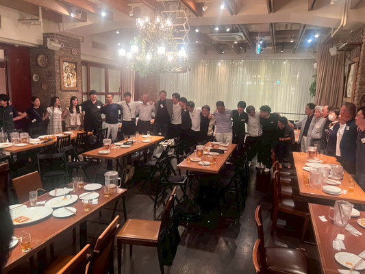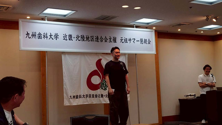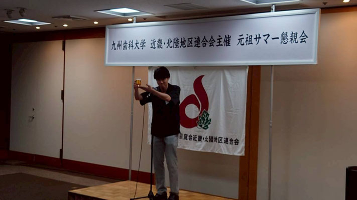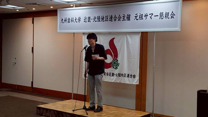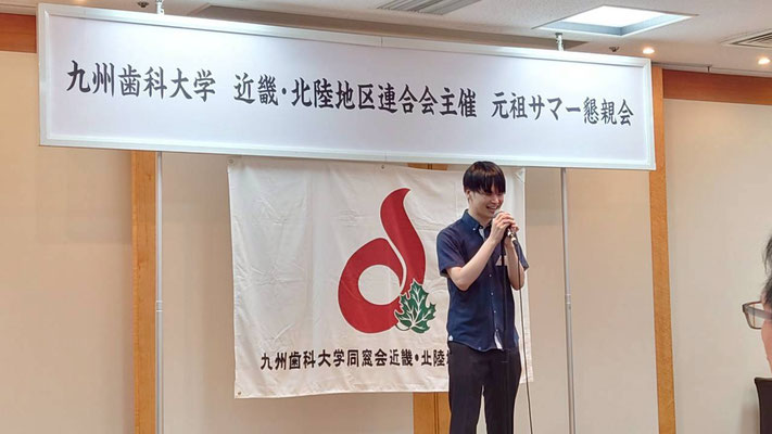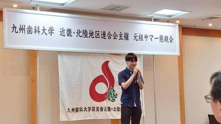 その後、研修医を代表して岡田遼先生(大73期)の乾杯のご発声によって盛大に開会。中島美裕先生(大67期)、森悠河先生(大69期)、岡純司先生(大71期)の司会のもと、参加した小倉芳成君(大75期5年生)の学生紹介などもあり、世代を超えて親睦を深めることができました。こうした親睦こそが九歯大の伝統のタスキが永遠と引き継がれていく礎となるものと信じて止みません。会場が同じビル内だということもあってか、二次会にもほとんどの先生方にご参加いただきました。近畿北陸地区連合会副会長の中野有史先生(大39期)による乾杯のご発声で開会。2次会から参加される勤務医の先生も多く、盛り上がりましたが、楽しかった宴席もあっという間に時間が過ぎていくものです。最後は青木修一先生(大29期)の閉会の辞に続き、萬代聡司先生(大58期)のエールをいただいた後、全員で高歌斉唱し熱気冷めやらぬままお開きとなりました。