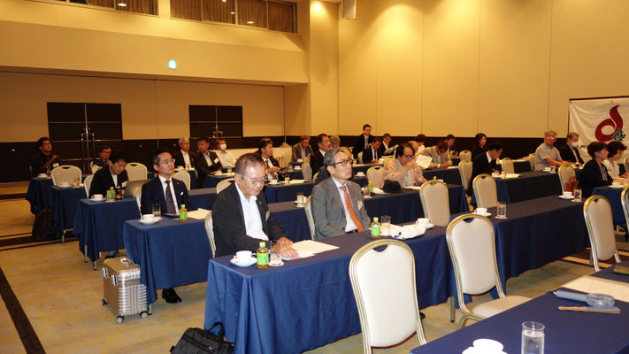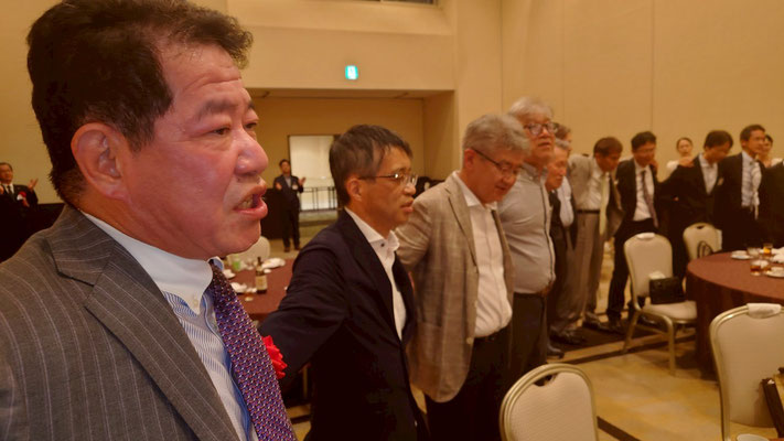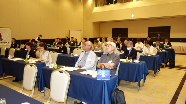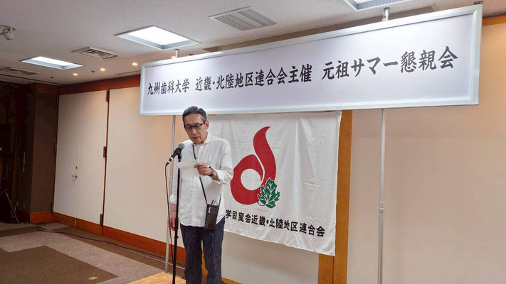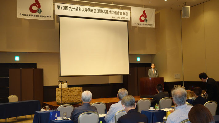 専務理事の高濱勉(大40期大阪)司会進行のもと 副会長の杉典子(大45期京都)先生により開会の辞に続いて 会長の長崎三男(大29期)先生が演壇に立たれ 挨拶の冒頭に九州歯科大学同窓会のなかでも連合会の活動はまさにこの近畿北陸地区からであり 戦後間もない近畿地方をジェーン台風が襲来し甚大な被害を受けたため その数年後に同窓の先生方が集い お互いの無事消息を確かめ合ったのが その始まりであったと語られました そして数えること70回の本年は先の能登半島地震で甚大な被害の出た北陸で開催され 今日多くの同窓が集まったことは非常に意義の深いことであることを述べられました